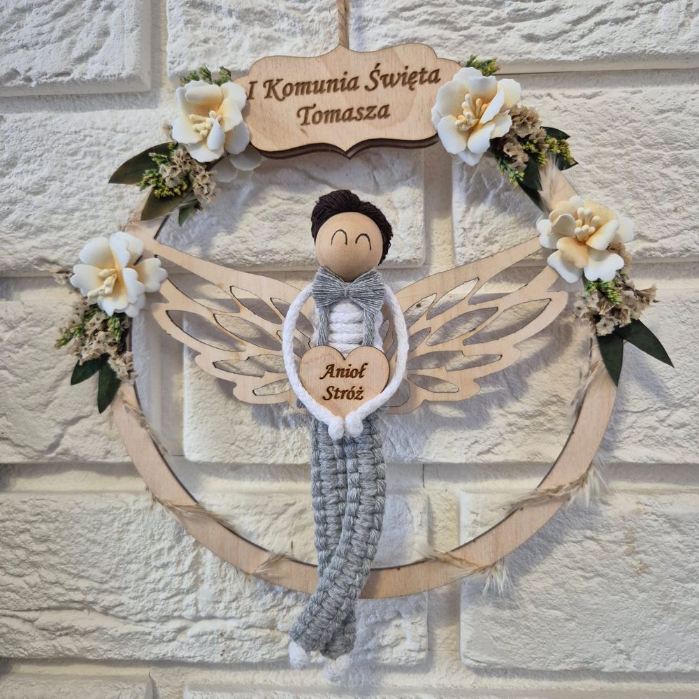 Ten makramowy aniołek na komunię w dekoracyjnym kole to elegancka i ponadczasowa pamiątka na Komunię Świętą dla chłopca, która pozostanie z nim na długie lata ✨