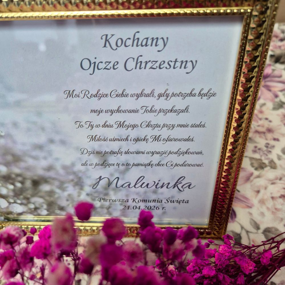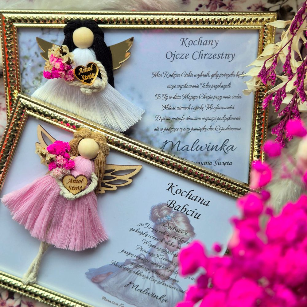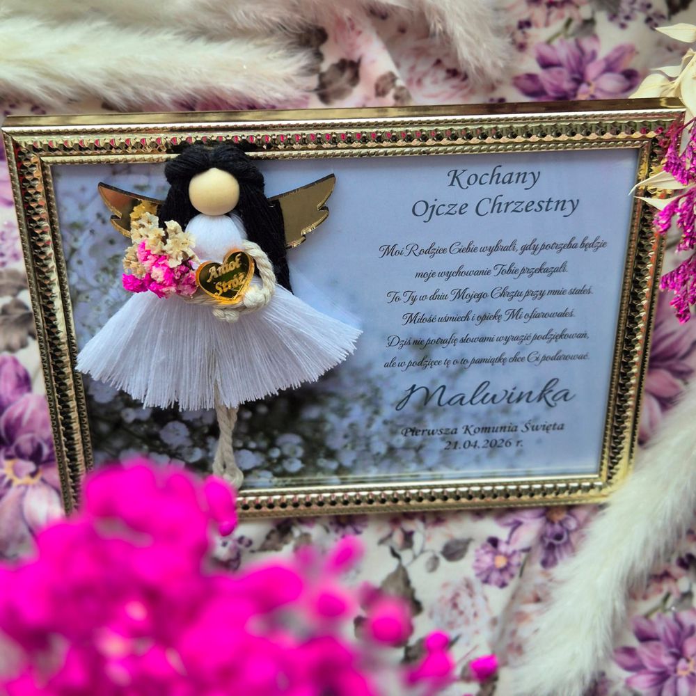 Anioł Stróż w ramce z personalizacją to eleganckie i wzruszające podziękowanie komunijne dla Chrzestnych lub Dziadków od dziecka. Starannie wykonany, zapakowany na prezent i gotowy do wręczenia 💝