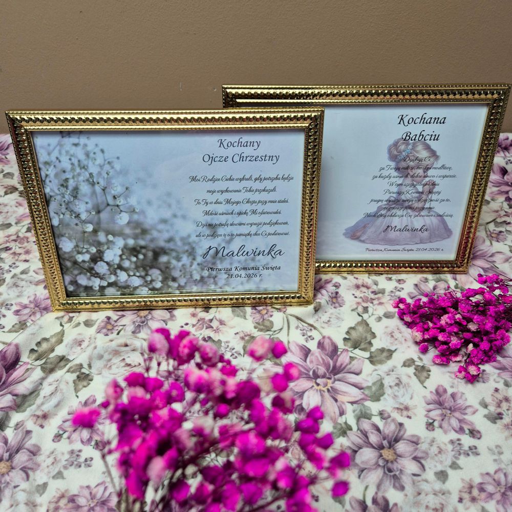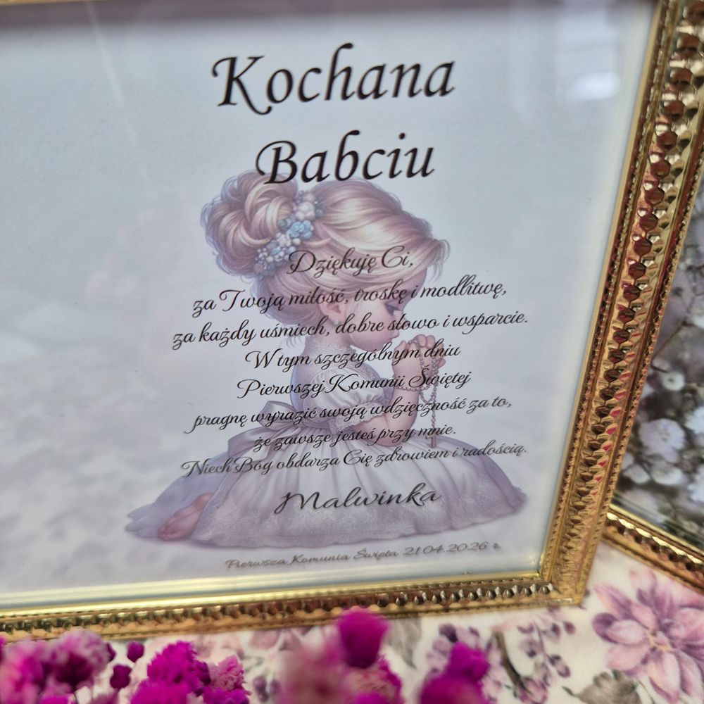 • Personalizacja: imię dziecka, data Komunii, tekst podziękowania