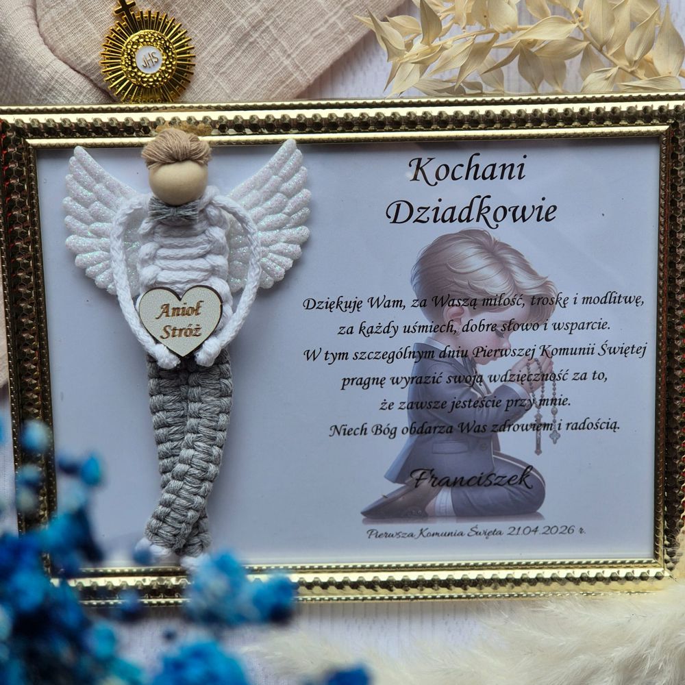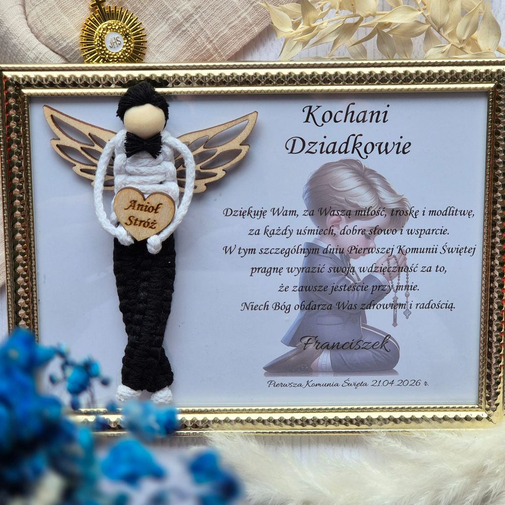 Personalizowany Anioł Stróż w ramce to eleganckie i wzruszające podziękowanie komunijne od chłopca dla Chrzestnych lub Dziadków. Minimalistyczny styl, stonowane kolory i gotowe pakowanie na prezent sprawiają, że to wybór idealny 🤍