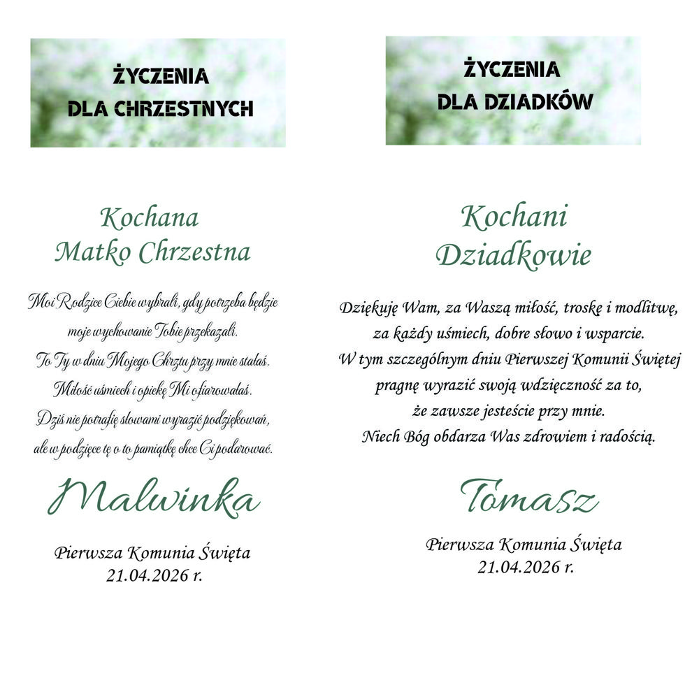 • Personalizacja: imię dziecka, data Komunii, treść podziękowania